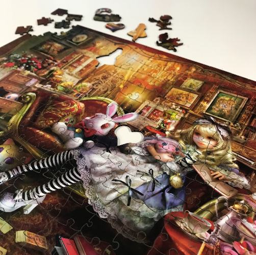 Our wooden puzzles are 2mm thick. Your image would be printed, glued onto wood and laser cut. The pieces are housed in a cloth bag and sturdy black box with your custom artwork on the lid and tray.