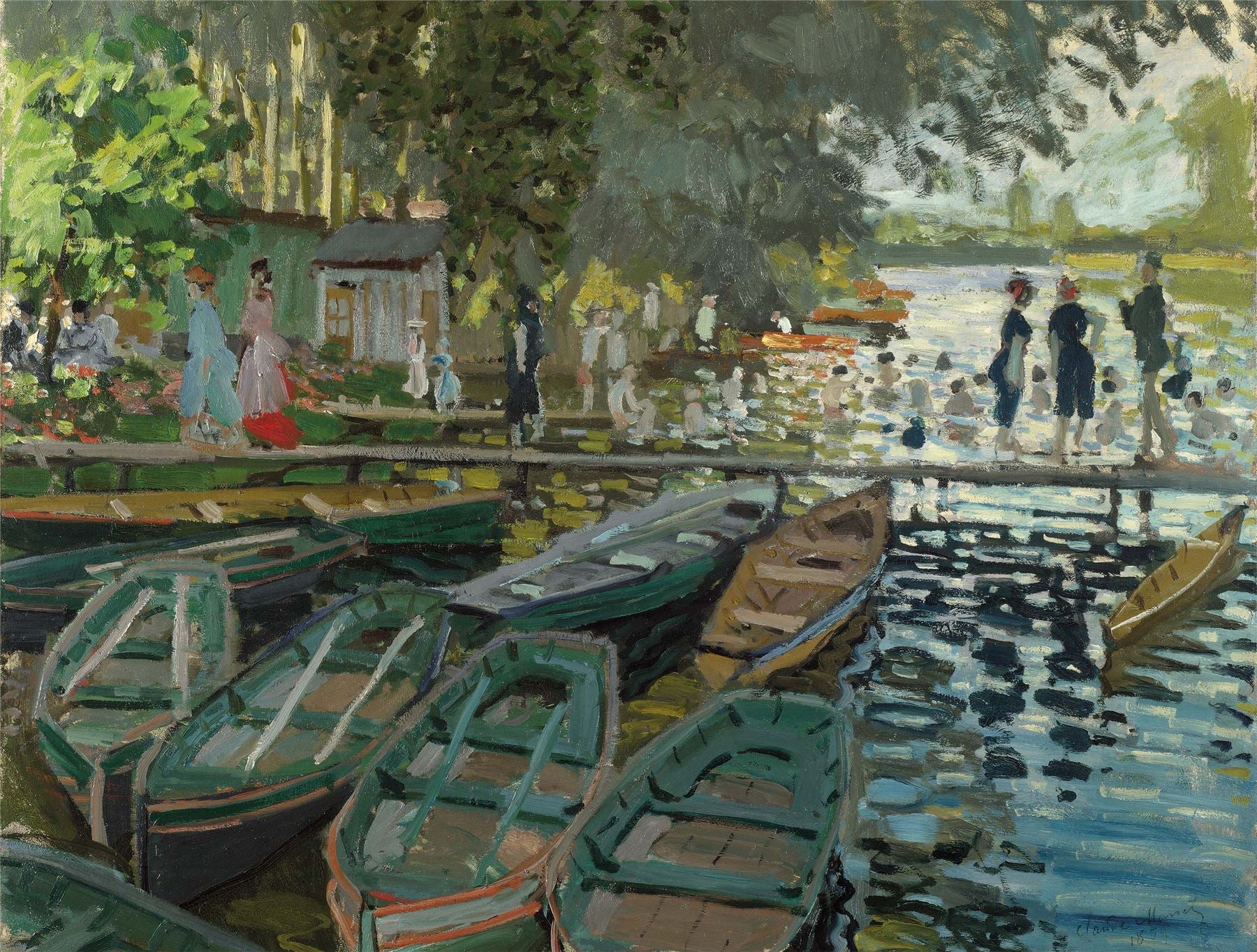 Painted by Claude Monet in 1869, this scene features La Grenouillere, a resort on the river Seine that was a popular weekend retreat during the 1860s. In this painting, we see a variety of bathers that were painted moment by moment in an impressionist style.