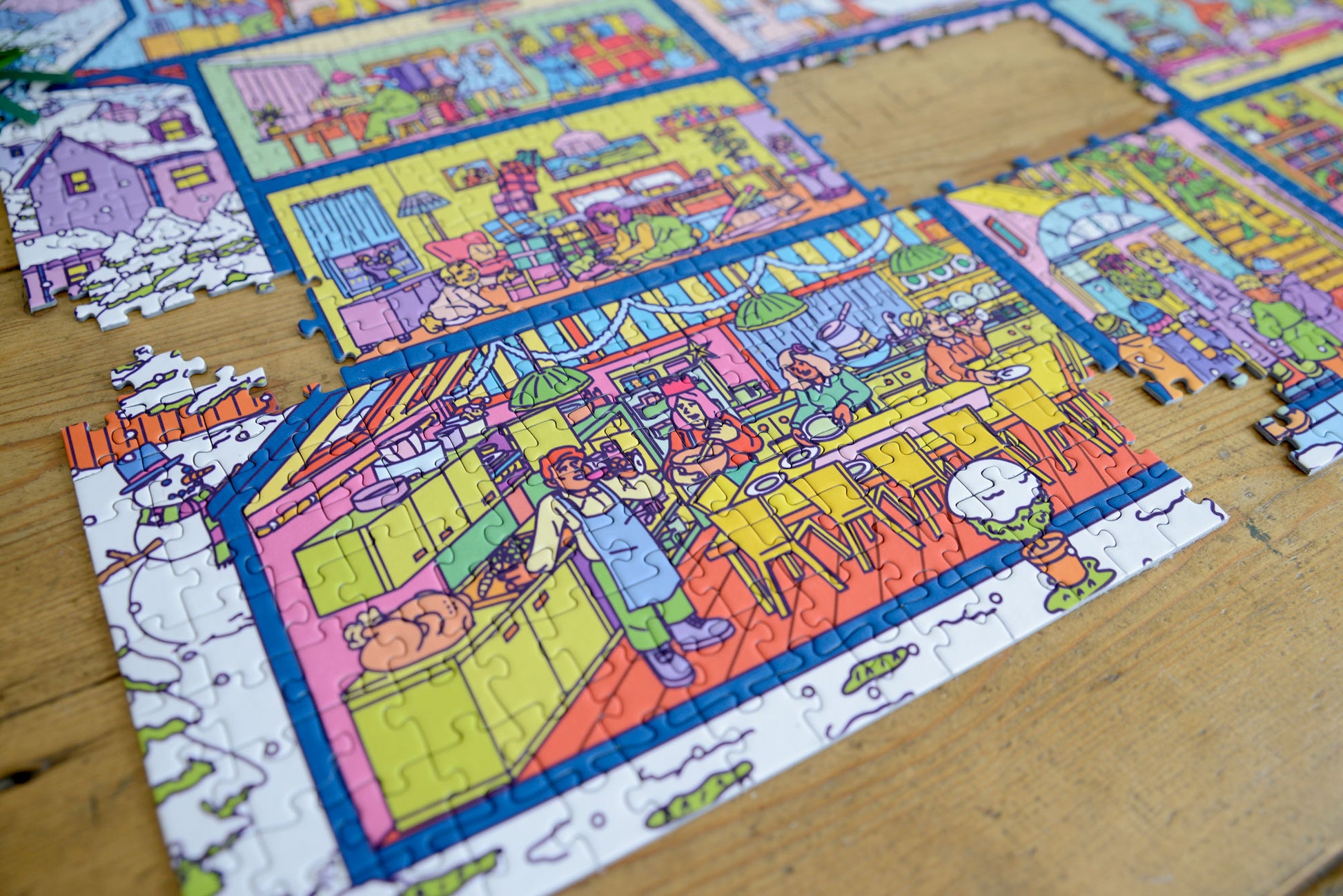 This whimsical jigsaw puzzle by Rob Pybus captures the magic of Christmas Eve, as carolers sing at the door and laughter echoes from floor to floor. From wrapping presents and cooking up a holiday feast to dancing elves and playful costumes, every corner is brimming with merry mayhem.