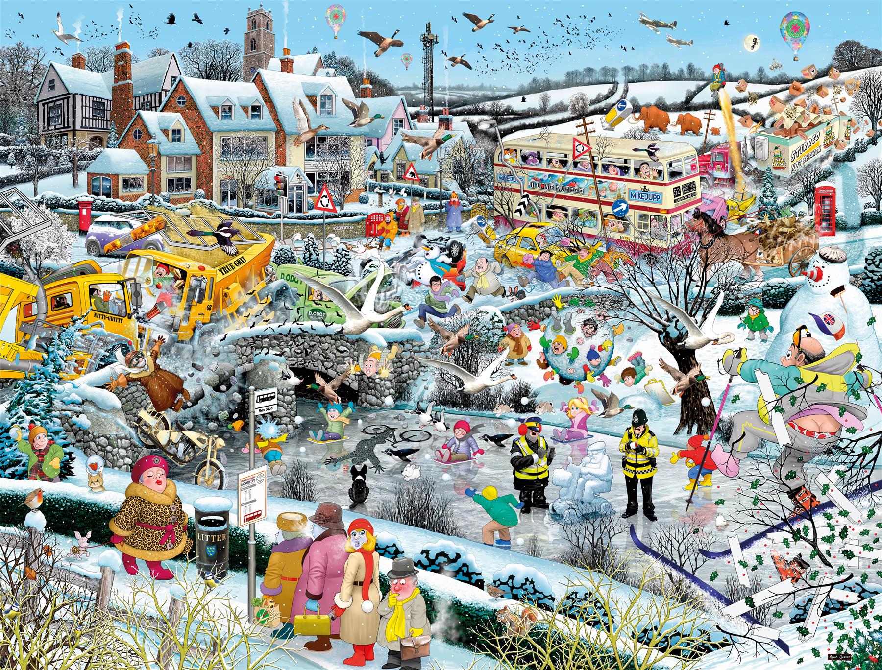 Can you spot a few familiar faces that Mike has dotted amongst his cast of crazy characters? Everything we love about winter has been crammed into this chaotic scene, ou'll be crying with laughter as you look for them all!