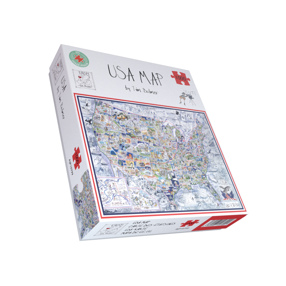 A stunning, whimsical and intricately detailed map jigsaw puzzle of the USA by the talented Tim Bulmer.